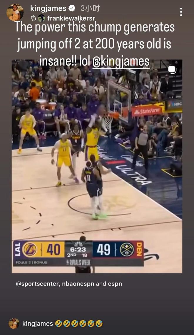 北京時間1月22日,詹姆斯在IG社媒上轉發了朋友的動態。他的朋友曬出詹姆斯在對陣掘金比賽中的扣籃畫面,并配文寫道:“這老家伙都200歲了,還能雙腳起跳爆發出這么恐怖的力量,太離譜了!”詹姆斯轉發時也配上了6個笑哭了的表情。